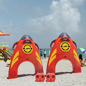 發(fā)現(xiàn)海邊遠處或近處有溺水狀況時,救生員可以立刻拋投R1,遙控出發(fā)營救溺水人員,速度可達到7m/s,以快速到達溺水者身邊。其次,它省去了花時間準(zhǔn)備裝備、召集救生員的過程,可進行單兵操作,節(jié)省成本,提高效率。