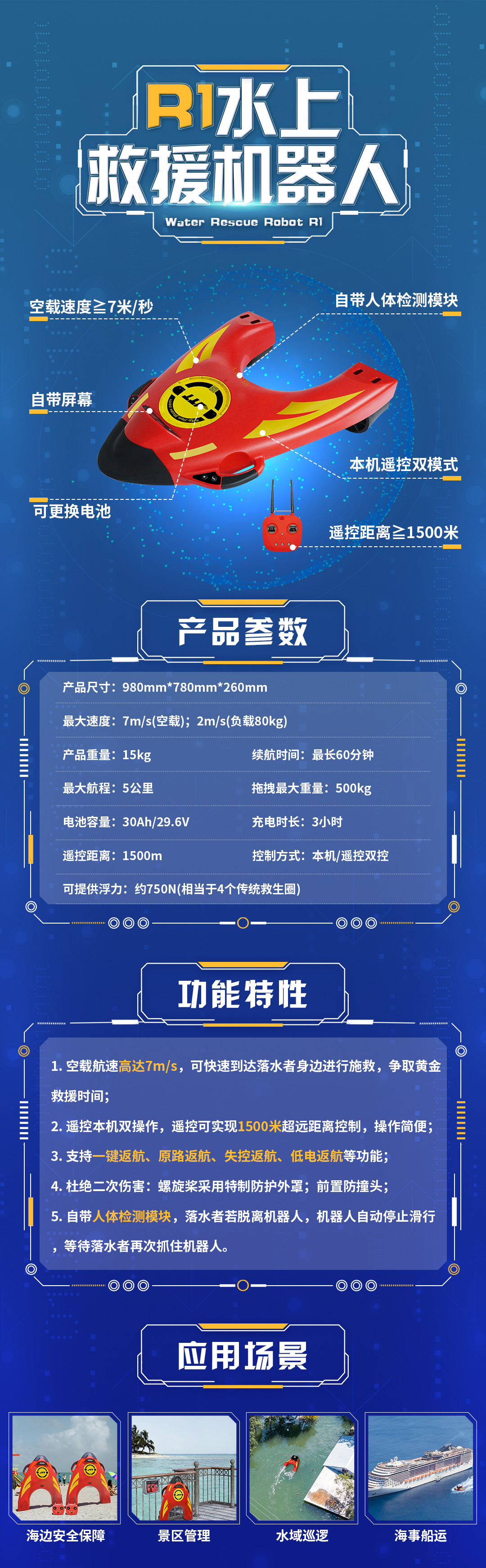 無人化水域救援可以應用到多個行業(yè)里,比如,旅游業(yè)的景區(qū)管理、海邊安全保障、水域巡邏,運輸業(yè)的海事船運,消防行業(yè)的抗洪救災,潛水打撈行業(yè)的水下搜尋及打撈、船體檢測等。當中可應用到上述場景的裝備有水上救援機器人、水上救援艇以及水下機器人。R1/R2水上救援機器人專注于水域環(huán)境中1-3人的緊急救援、水域巡邏,在日常的巡邏工作中,如果發(fā)現(xiàn)不慎落水者,救援隊可以隨時拋投R1/R2出發(fā),遙控操控,并以最快7.8m/s的速度,抵達落水者身邊;T1水上救援艇專注于4-6人大規(guī)模的水域救援,入水自動充氣識別,可以搭載對講、喊話、照明設備,遙控操控,在洪災救援、內河、輪渡等場景運作高效;P1水下機器人專注于水下的搜尋、拍攝、打撈、檢查,具備鋁合金緊湊型機身,可以避免蛙人在寒冷天氣下的水下工作。