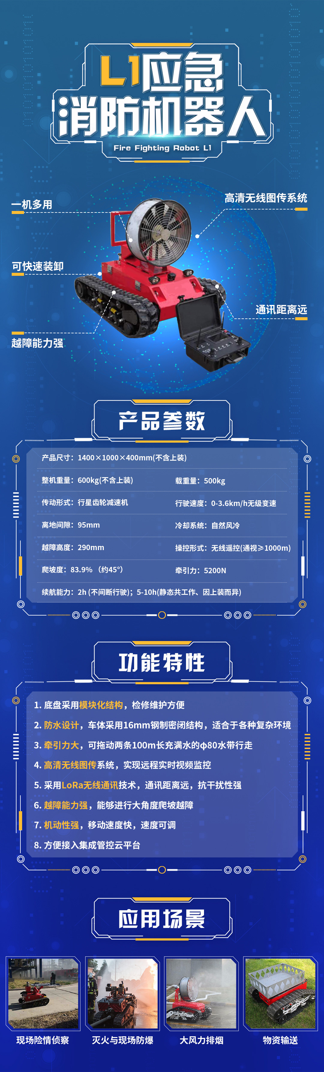從19世紀末開始全球開始氣溫升高,平均氣溫上升了0.3~0.6度,隨之而來的是一系列的環(huán)境災害,而火災就是其中一種。每年,在不管是成功營救或者是損失的數(shù)字背后,都是以一條條消防員/受害者生命所疊加而成的。而無人化消防救援解決方案卻能夠為此帶來低損失成本和高滅火救災效率。L1應急消防機器人,它能夠充當消防員進行現(xiàn)場險情偵察、緊急滅火、大風力排煙、探測巡檢、物資輸送、現(xiàn)場防爆。