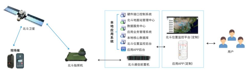 ① 中心端軟硬件系統包括1-北斗指揮機、2-北斗衛星收發單元,3-本地應用系統、4-北斗RDSS專用服務器、5-北斗監控平臺與APP五大部分組成;