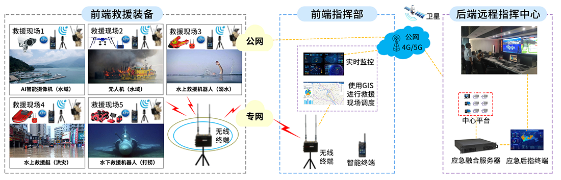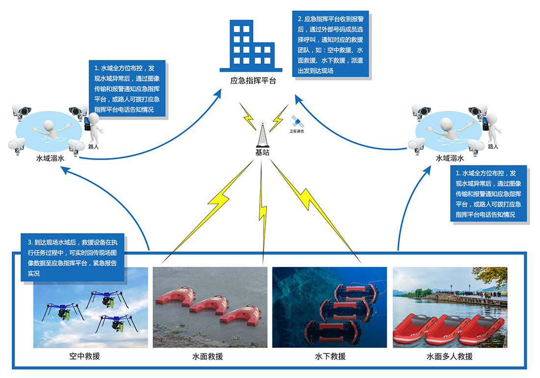 水域救援系統(tǒng)前端智能救援設備主要包括水域AI智能攝像機、空中救援無人機、水上救援機器人、水上救援艇、水下救援機器人等,組成從空中、水面、水下立體化救援系統(tǒng),應對不同的救援場景需求,所有前端智能救援設備均與前端指揮部及后端指揮中心組成一體,聽命于應急管理平臺的統(tǒng)一調(diào)度,讓指揮救援工作有序、有效地進行。
