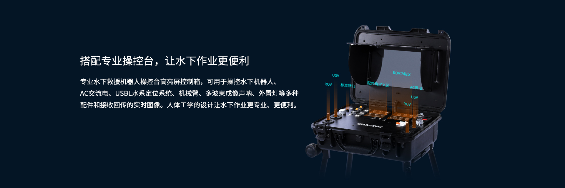 搭配專(zhuān)業(yè)操控臺(tái),讓水下作業(yè)更便利:專(zhuān)業(yè)水下救援機(jī)器人操控臺(tái)高亮屏控制箱,可用于操控水下機(jī)器人、AC交流電、USBL水系定位系統(tǒng)、機(jī)械臂、多波束成像聲吶、外置燈等多種配件和接收回傳的實(shí)時(shí)圖像。人體工學(xué)的設(shè)計(jì)讓水下作業(yè)更專(zhuān)業(yè)、更便利。