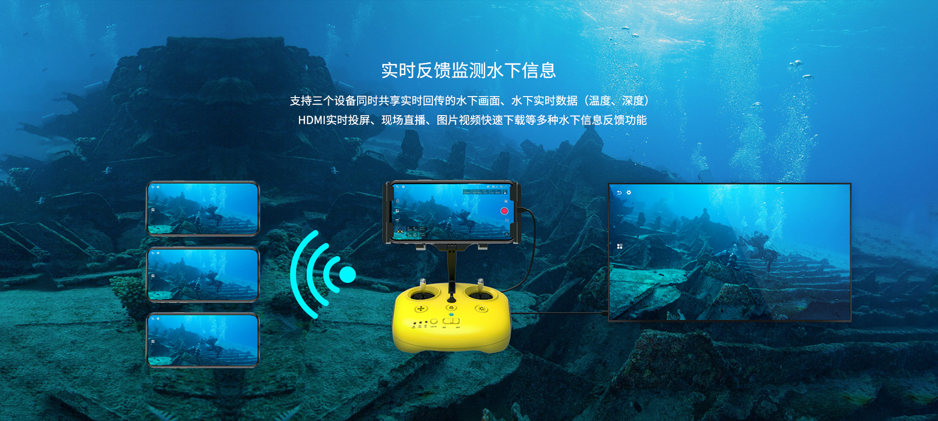 實(shí)時(shí)反饋監(jiān)測(cè)水下信息:支持三個(gè)設(shè)備同時(shí)共享實(shí)時(shí)回傳的水下畫(huà)面、水下實(shí)時(shí)數(shù)據(jù)(溫度、深度)HDMI實(shí)時(shí)投屏、現(xiàn)場(chǎng)直播、圖片視頻快速下載等多種水下信息反饋功能。